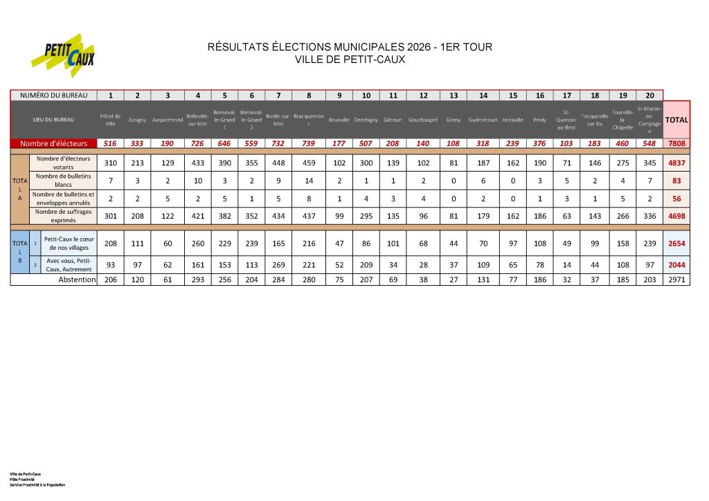 Retrouvez les résultats du 1er tour des élections municipales à Petit-Caux, détaillés par bureau de vote. Résultats élections municipales 2026 – premier tour 220,5 Ko – pdf